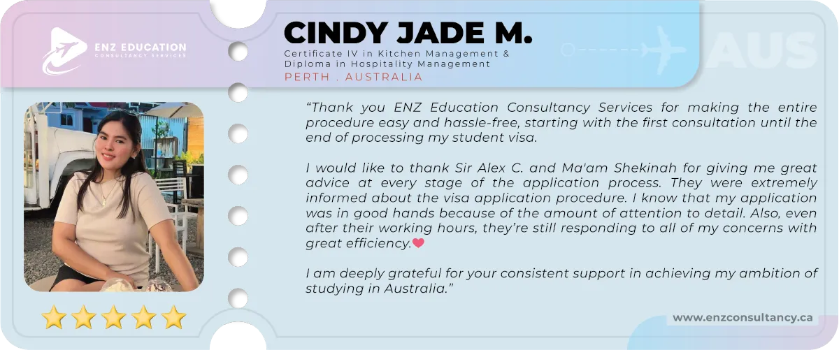 "Thank you ENZ for an outstanding service and to your explicit team. Their enthusiastic and well-experienced education consultants make every step in processing my visa hassle free and on point. You never disappointed me from the start til my visa granted!😱 Especially sir Gian, my agent, who was really kind and patient throughout the whole process. I'll definitely recommend ENZ for other aspirants, like me, who wants to start their journey in Australia. Thank you so much and Godbless! ❤"