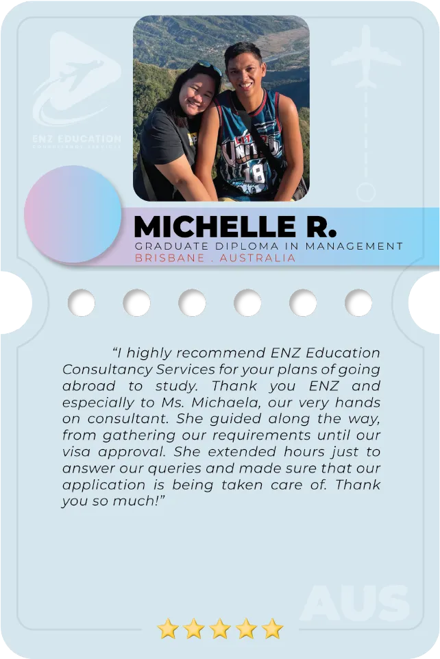 "Everyone at ENZ are client-friendly and aside from that, they have an excellent service. I would like to thank the ENZ Education Consultancy Services, especially Mr. Eric Bryan Simon for patiently handling my documents 'till the end. Thank you for all the efforts and support. Without your/their help it would be difficult for me to achieve one of my dream. They made everything easier for us. It took less than a day to approved my visa and that was a big relief. I am now one step closer into my dream. I would gladly recommend this agency to those who are planning to have their education abroad. Again, thank you so much and God bless ENZ Education Consultancy Services."